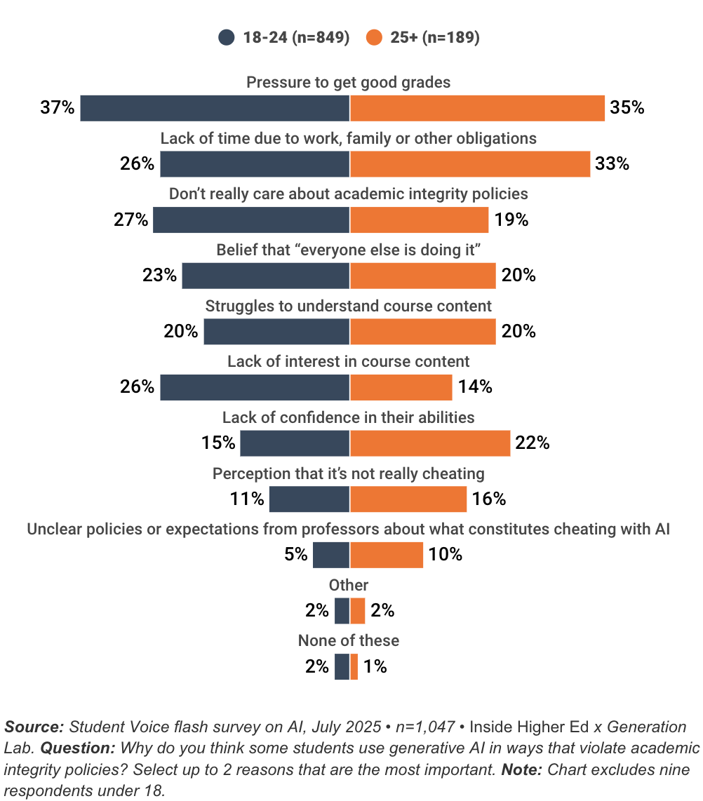 调查显示,取得好成绩的压力是学生认为同龄人违规使用生成式AI的首要原因(占比37%),其次是时间紧迫(27%)和对学术诚信政策漠不关心(26%)。