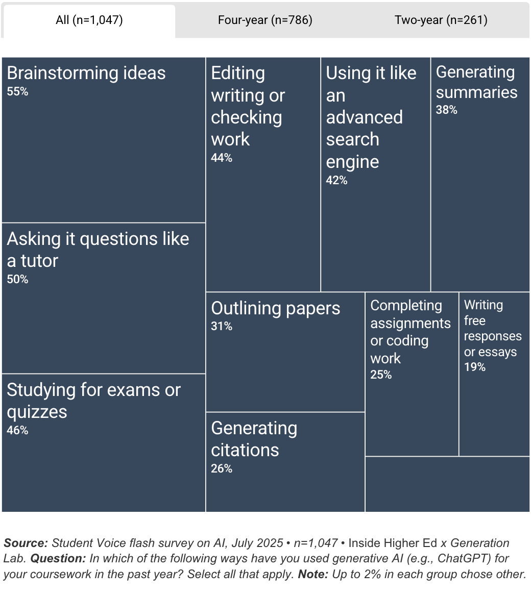 绝大部分学生——大约85%——表示他们在过去一年里用过生成式AI来处理课程作业。从一大堆选项里挑出的前三大用途是: