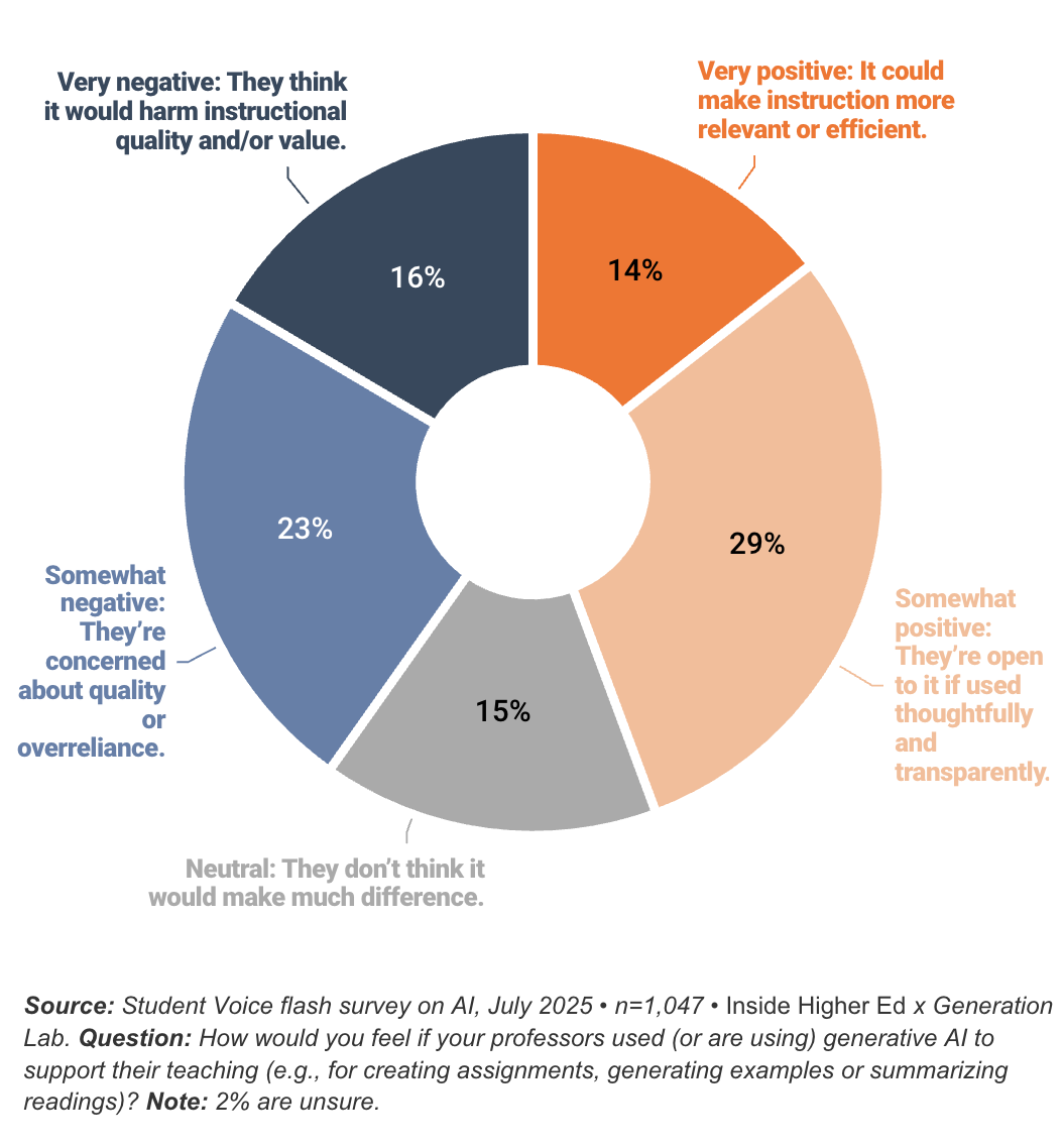 但39%的学生表现出不同程度的担忧,主要聚焦教学质量与过度依赖问题——这与教育工作者对学生使用AI的顾虑如出一辙。