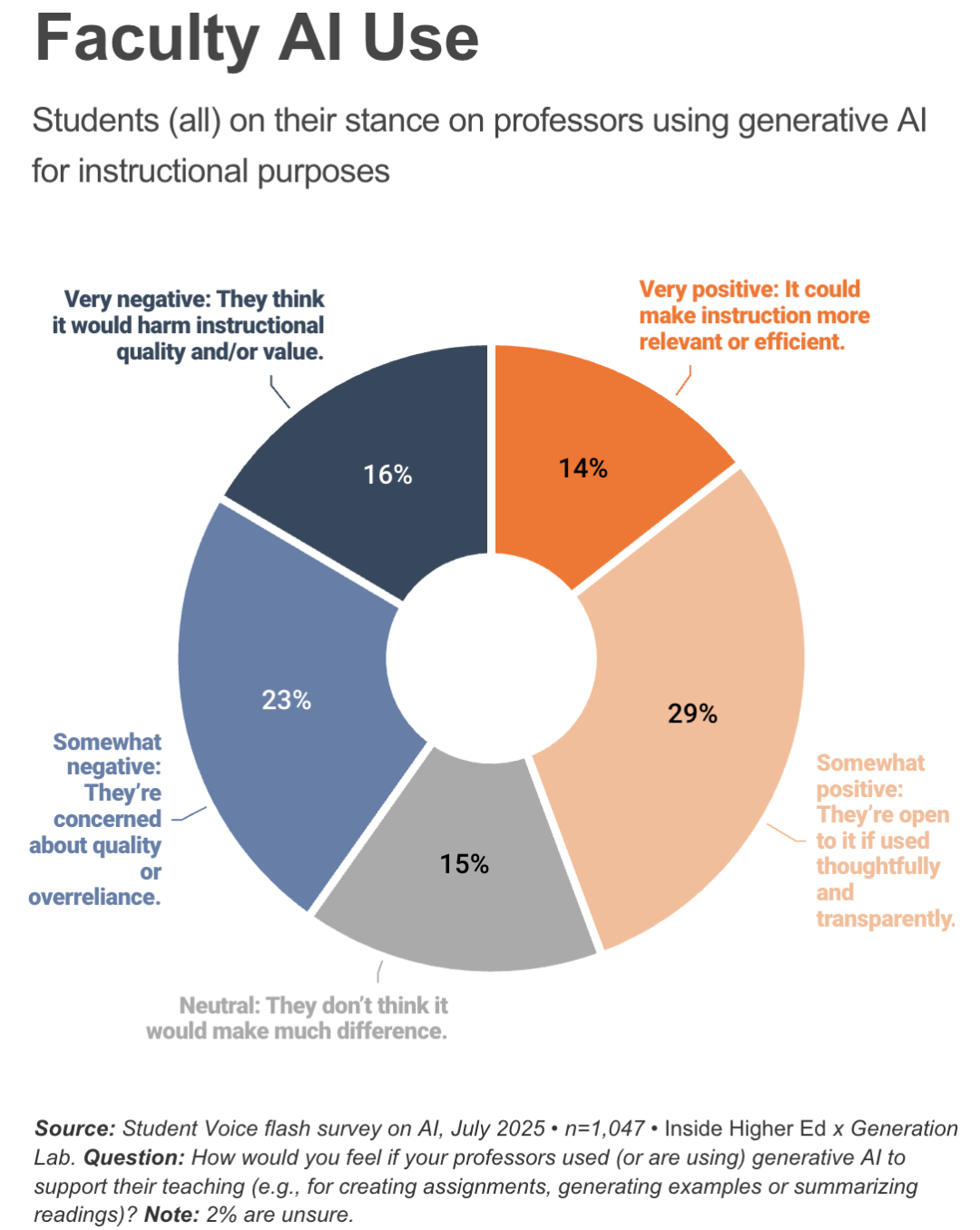 然而,使用AI检测软件(仅21%支持)和限制课堂技术使用(仅18%支持)等手段并不受欢迎。相反,教育学生如何合理使用AI(53%支持)以及制定更清晰、统一的AI工具使用规范(尽管此前调查显示作弊动机多样)更受青睐。