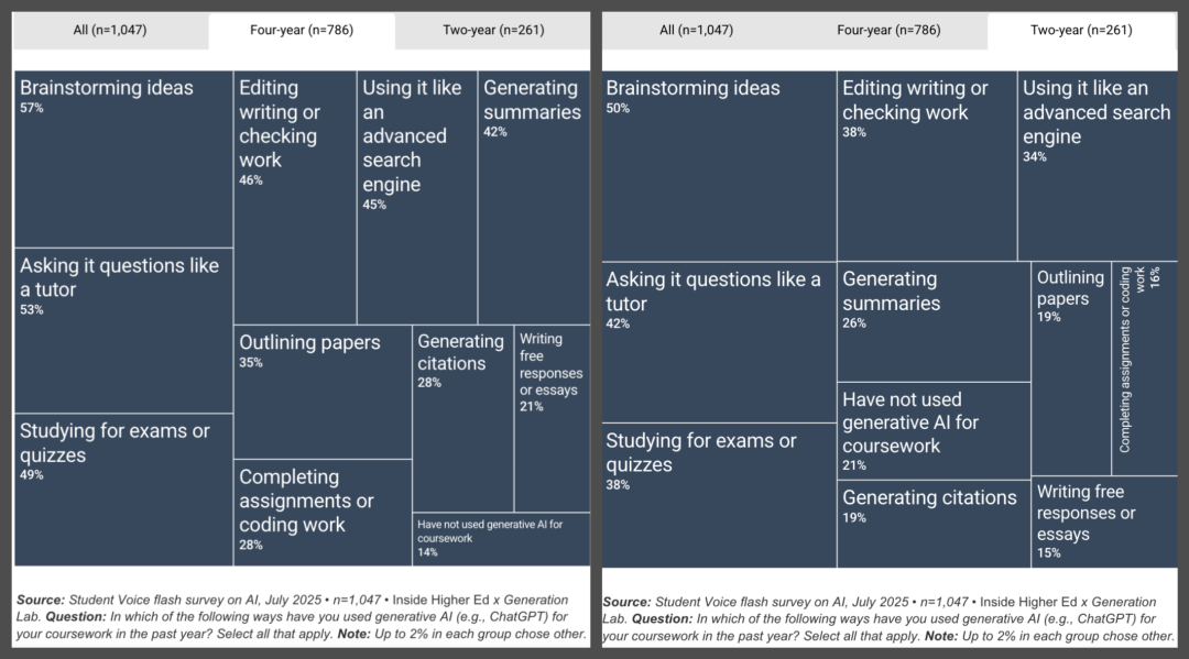 无论整体或具体场景下,社区大学学生的AI使用率都更低。 两年制学生中21%表示过去一年没有使用过AI,而四年制学生该比例为14%。