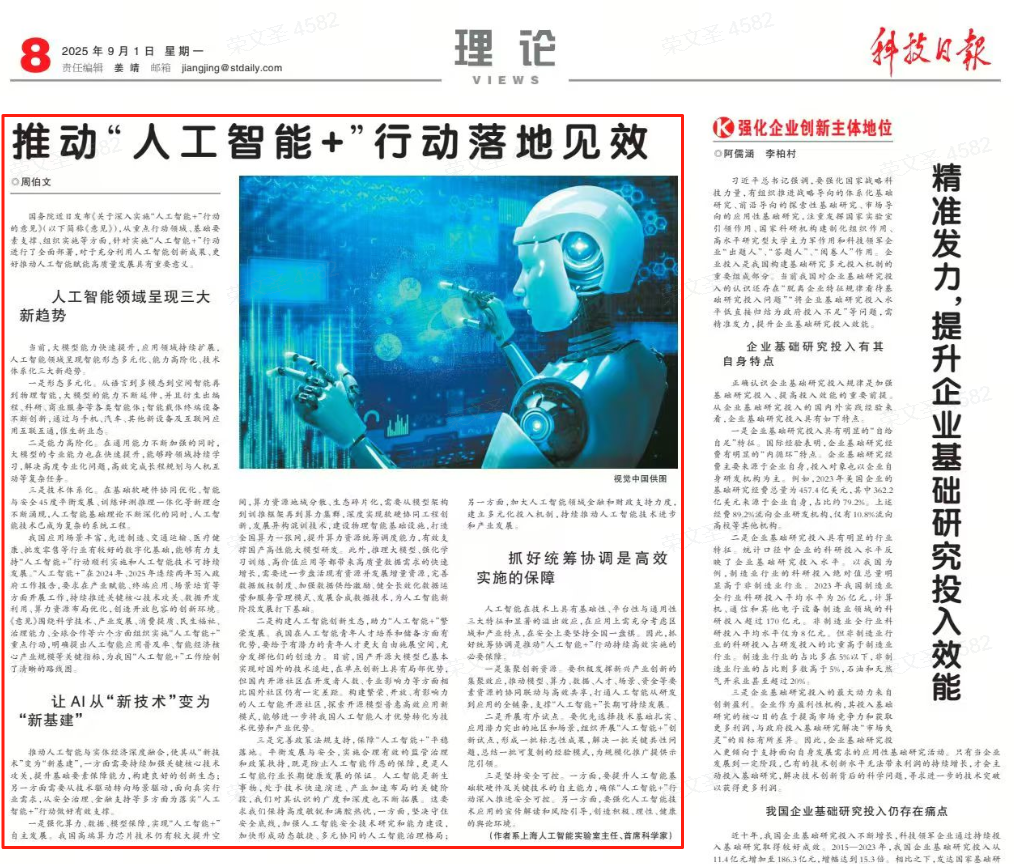 9月1日,《科技日报》刊登上海人工智能实验室主任、首席科学家周伯文署名文章——《推动“人工智能+”行动落地见效》。作为人工智能领域的战略科学家,他在文中分享了对“人工智能+”行动落地的思考与见解。