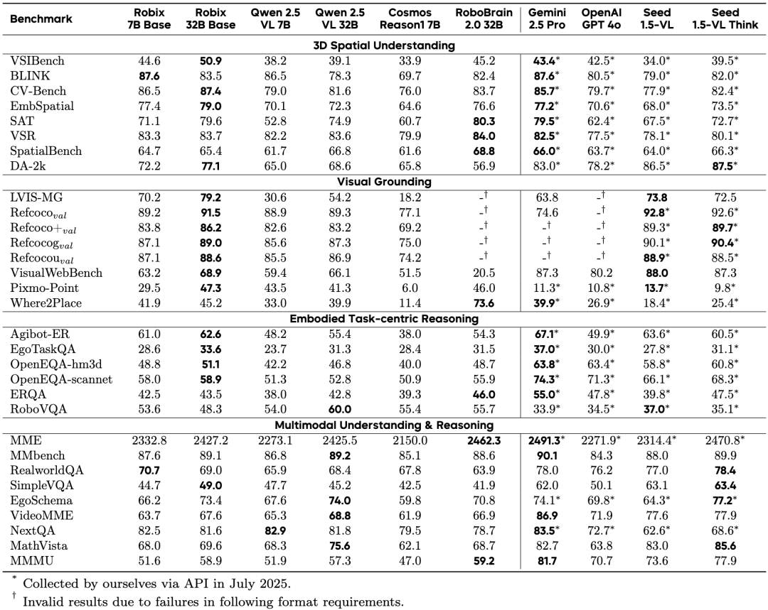 在基础能力测试上,Robix的两个版本(7B和32B)在8个空间理解任务中有7个比Qwen2.5-VL 表现好,平均准确率更高;