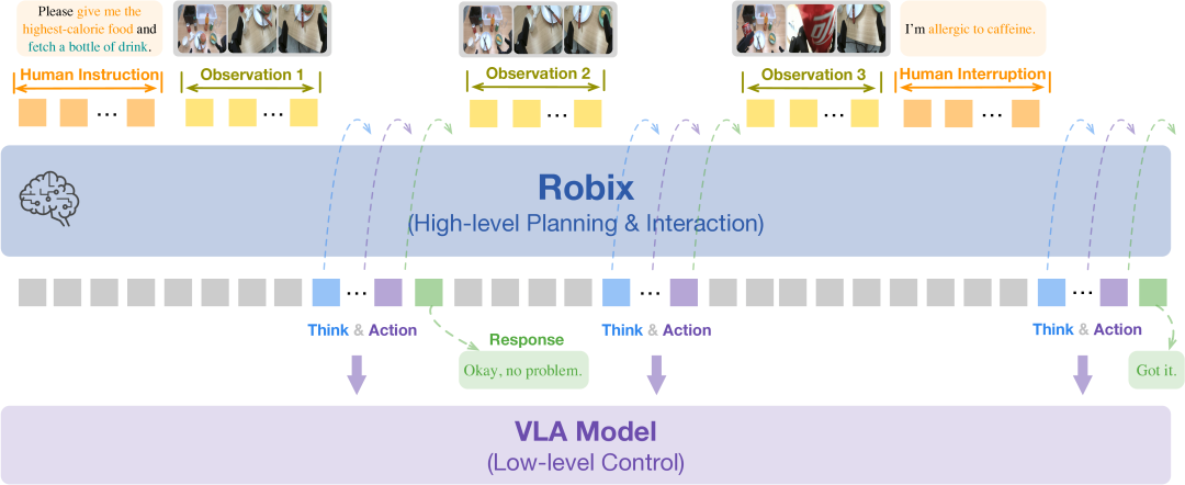 首先,团队的思路是把机器人系统分为两层,高层认知和底层执行,Robix就是管高层认知的。