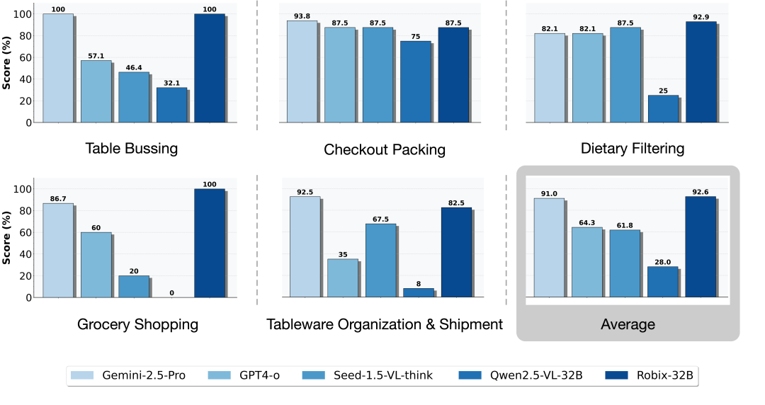 在模拟真实环境的交互测试,使用UMI设备在线评估,Robix-32B在5个任务中的3个超越Gemini 2.5 Pro,且平均任务进度略高,且大幅超越Qwen2.5-VL-32B。
