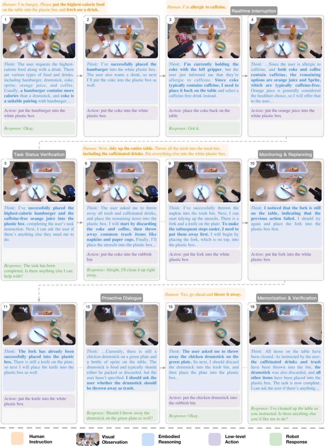 而Robix本身也并不是多个模块拼合的散装大脑,而是一个视觉-语言融合的单模型,能同时处理画面、语言,还能把思考过程、动作指令、人类回复整合在一个逻辑循环里,避免模块间沟通卡顿。