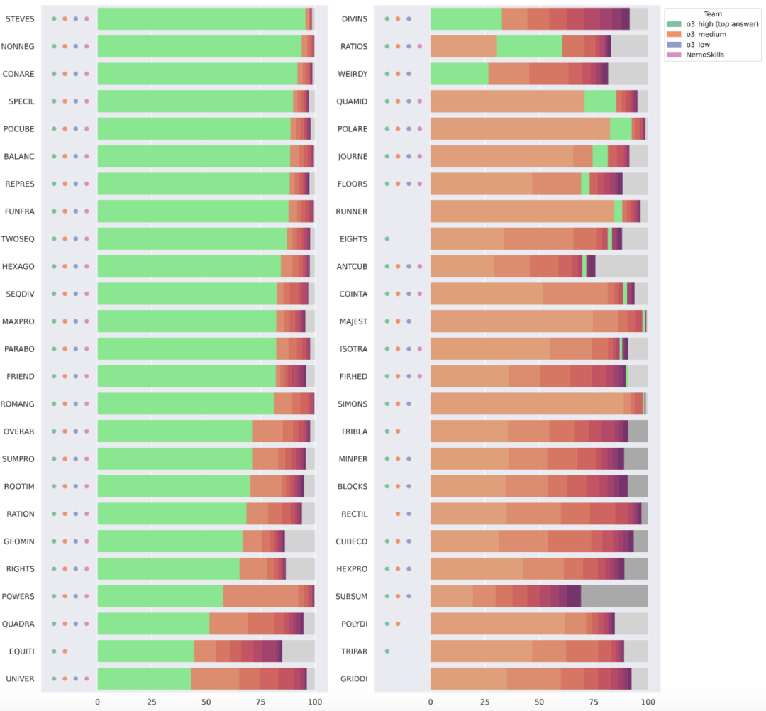 这表明,o3-preview在原则上,具备为全部50道题产生正确答案的能力。