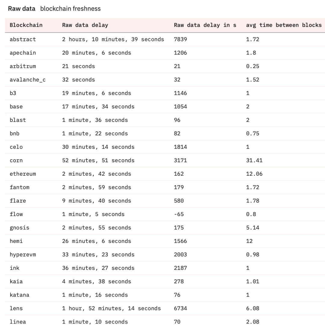 与此同时,社区驱动的Dune提供了从原始区块数据到“解码、整理”数据层的持续刷新流程,允许分析师直接以SQL构建高度定制的查询与看板;其文档对数据新鲜度进行分层解释,并引入面向实时/低延迟场景的Sim APIs,用于构建“实时钱包”与AI代理等应用,说明其数据链路已针对准实时与实时使用场景进行了工程化分层。