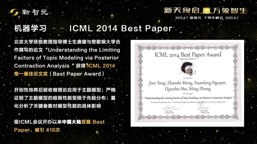 2014年,他作为一作拿下了ICML唯一Best Paper,这是中国大陆学者首次在该顶会上获此殊荣。