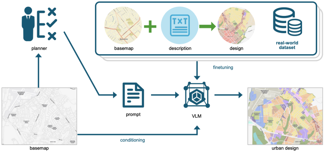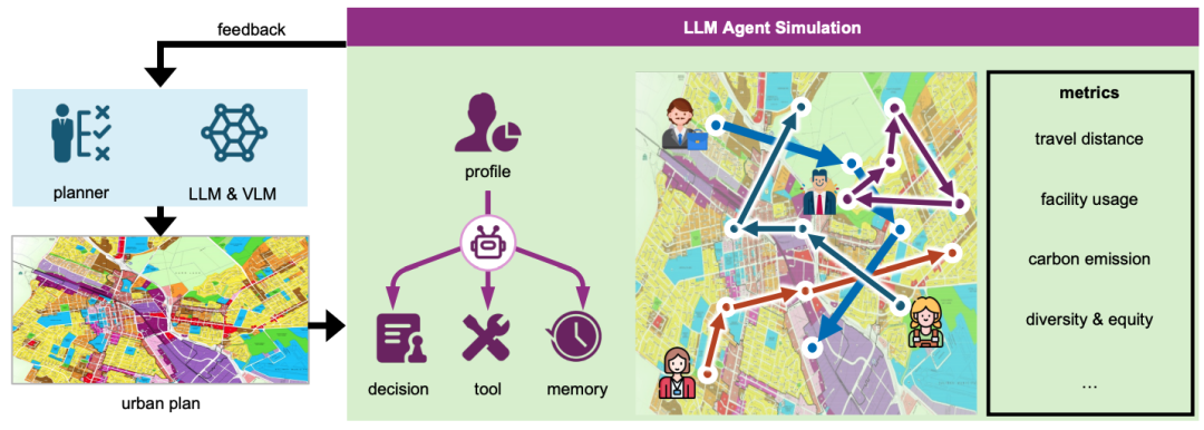 2. 方案生成:VLM化身“视觉设计师”,将文字转化为蓝图该框架利用视觉大模型(VLM)将抽象的文本概念转化为具体的、可视化的城市设计方案。规划师可以通过文本指令(Prompt)精确描述规划概念和约束条件,经过城市设计数据微调的VLM能够生成精细的视觉输出,如土地利用布局、建筑轮廓,甚至是逼真的三维城市场景,同时还能确保设计符合地理等现实约束。3. 效果评估:LLM智能体构建“虚拟城市”,预演未来生活为了对规划方案进行科学评估,框架引入了LLM智能体进行城市动态模拟。研究人员为智能体设定不同的人口统计学特征(如年龄、职业),让它们在生成的虚拟城市中模拟居民的日常出行、设施使用等活动。通过分析这些模拟行为,可以得到关于交通距离、设施使用率、碳排放、社会公平性等多维度的量化评估指标,为规划方案的迭代优化提供科学、前瞻性的反馈。