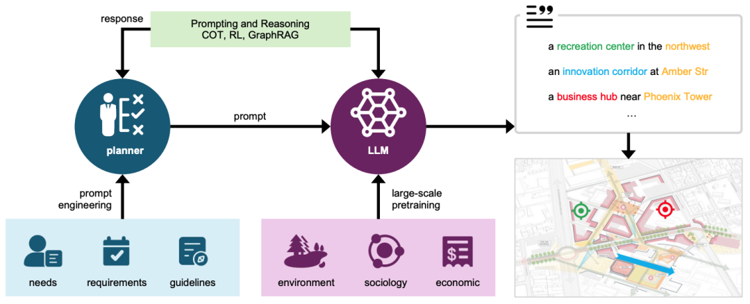 近年来,以生成对抗网络(GANs)和强化学习(RL)为代表的传统AI模型开始应用于城市规划,在生成街道网络、功能分区等方面展现了潜力。但这些模型通常是为特定任务设计的,知识面狭窄,难以应对现代城市规划与日俱增的跨学科复杂性。大语言模型(LLM)的出现,以其强大的知识整合、逻辑推理和多模态生成能力,为突破这一瓶颈带来了历史性机遇。