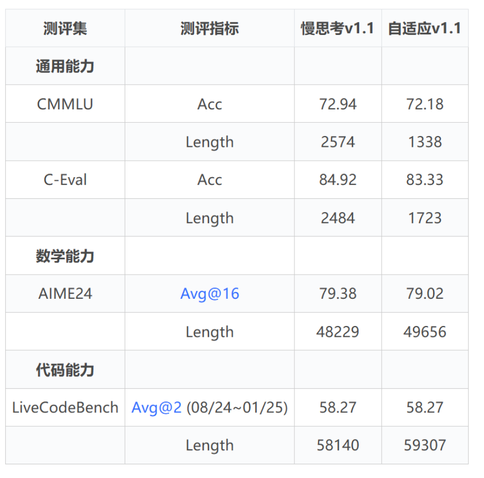 在某些基准测试中(例如中文综合知识测试集CMMLU),新模型在保持精度基本不变的前提下,将平均输出的思维链长度减少了近50%!也就是说,同一道简单题,它给出的解释步骤几乎缩短了一半,直接带来响应效率的翻倍提升。