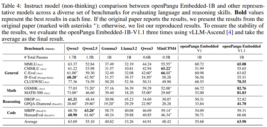值得惊喜的是,openPangu系列近期不仅升级了7B模型,还推出了一款专为边缘AI部署优化的轻量级模型——openPangu-Embedded-1B。