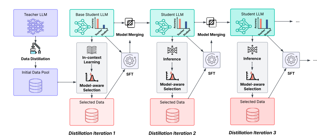完成一轮训练后,产生的多个模型版本(不同检查点)不会简单取舍,而是通过参数增量融合(inter-iteration merging)合并成统一的模型。这一步相当于将新学到的知识与原有能力进行“汇总融合”,让模型的认知更加稳固,避免遗忘过去学到的本领。