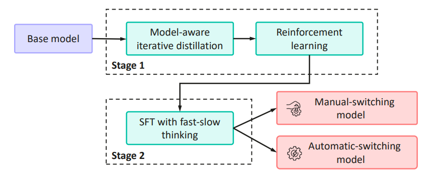 他们精心构建了一个混合训练数据集:在用户提问(Prompt)中附加特殊的标识符,直接告诉模型该用快思考还是慢思考来回答。通过在这个带有明确指示信号的数据上训练,模型学会将特定输入模式与对应的思维方式、回答风格建立关联。
