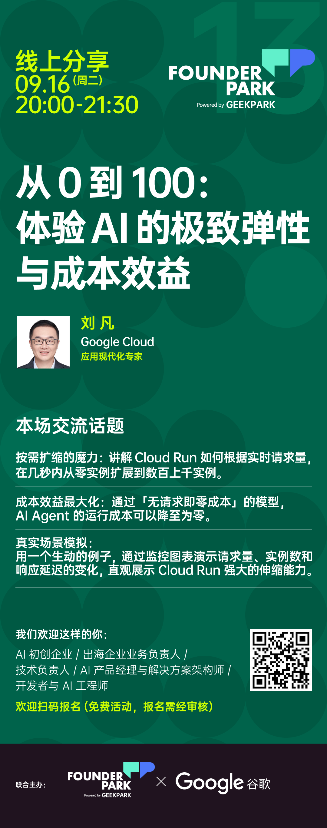 下周二(9 月 16 日),我们邀请到了 Google Cloud 应用现代化专家刘凡,来分享使用 Cloud Run 开发的技巧,以及如何做到极致的成本控制。