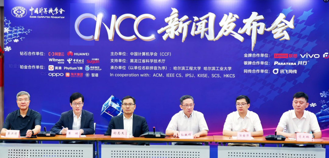 出席发布会的嘉宾包括:CNCC2025指导委员会主席、CCF理事长,中国工程院院士,中国科学院计算技术研究所研究员孙凝晖;大会副主席、程序委员会主席、CCF常务理事,哈尔滨工程大学教授於志文;大会论坛委员会主席(学术界)、CCF理事、副秘书长、青工委主任,清华大学长聘副教授崔鹏;大会承办校代表哈尔滨工程大学教授苘大鹏;大会承办校代表哈尔滨工业大学教授汪国华。发布会由大会宣传委员会主席、CCF副秘书长王新霞主持。