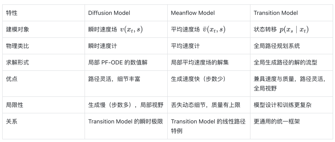 从解的形式上讲 Diffusion是局部PF-ODE的数值解,meanflow是局部平均速度场中的解集,transition model求的是全局生成路径上的解的流型,special case情况下可以退化为平均速度场,解的流型退化为局部解集。