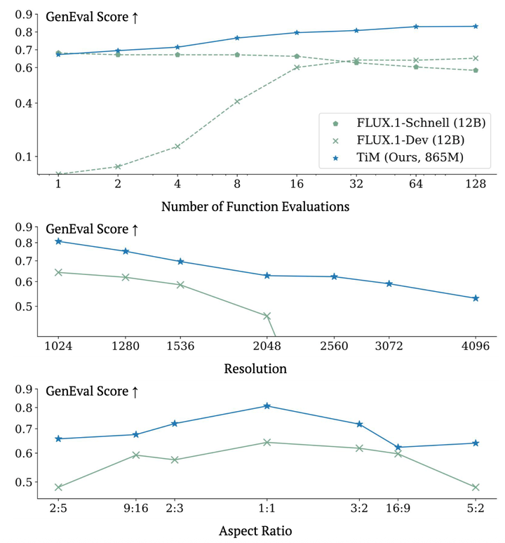 实验表明,TiM-865M在多分辨率与多横纵比设置下,少步即可超越 FLUX.1-Schnell/Dev(12B)的速度-质量权衡。