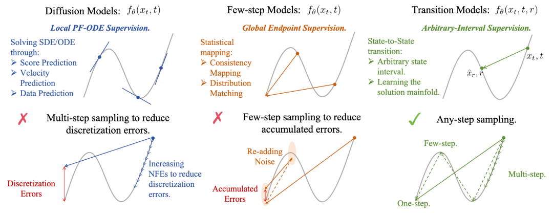 这些固有的缺陷来源于模型训练过程中监督信号的引入方式,或是求解局部的PFE方程,或是匹配固定的概率分布;换句话说,生成过程中,模型做出预测被clean data所监督的粒度,直接决定了模型在推理过程中的离散误差和生成质量上限。