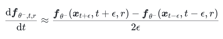 在Transition Model的训练过程中,它的训练目标的关键在于计算网络关于时间的导数$\frac{\mathrm{d} f_{\theta^{-}, t, r}}{\mathrm{d} t}$。