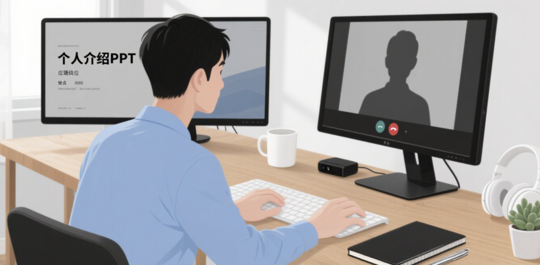 面试的时候,可以准备两个显示屏,这样可以一个屏幕放个人介绍的ppt,一个屏幕放视频通话的窗口。这样能让你直视面试官的眼睛,直接和面试官眼神交流。