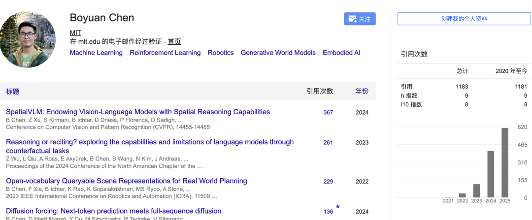 他发表的多篇论文,在学术界和工业界均获得认可,包括《Diffusion Forcing》、《SpatialVLM》和《History Guidance》等。