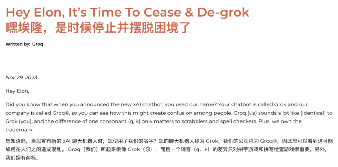 还有他们的名字——Groq和Grok看起来很像不是么?他们甚至就此“喊话”过埃隆马斯克,痛斥其“剽窃”自己的名字。