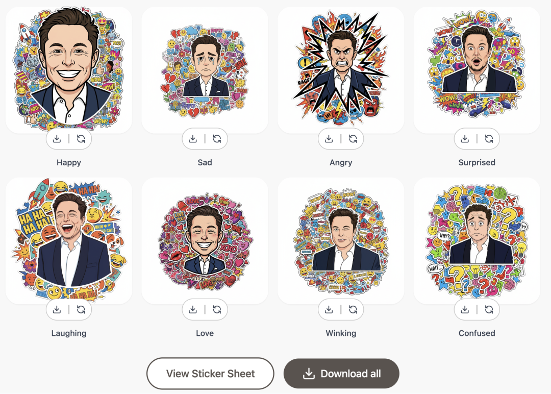 传完照片并选好风格后,会自动生成八张不同表情的贴画,可以选择喜欢的下载,也可以直接all in。