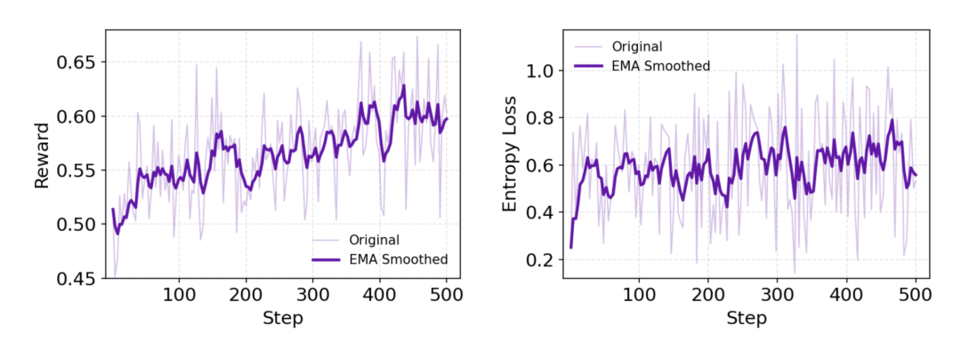训练过程的动态指标显示,模型学习效果显著,奖励(reward)呈持续上升趋势。同时,策略熵(policy entropy)始终维持在较高水平,这表明模型在持续进行探索,有效防止了过早收敛。