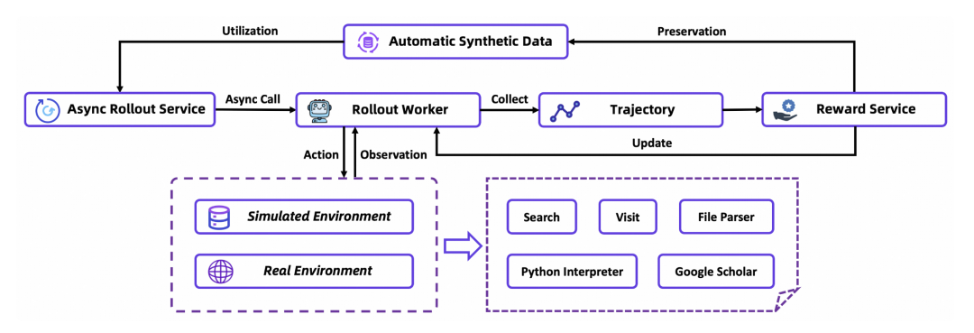 仿真训练环境:依赖实时Web API进行开发成本高昂、速度慢且不一致。我们利用离线维基百科数据库和自定义工具套件创建了一个模拟训练环境来解决这一问题。并且通过SailorFog-QA-V2的流程,为该环境生成专属的高质量数据,创建了一个经济高效、快速可控的平台,显著加快了我们的研究和迭代速度。 稳定高效的工具沙盒:为了确保在智能体训练和评估期间对工具的稳定调用,我们开发了一个统一的沙盒。该沙盒通过缓存结果、重试失败的调用以及饱和式响应等改进来高效地处理并发和故障。这为智能体提供了快速且鲁棒的交互环境,可以有效防止工具的错误响应破坏其学习轨迹。 自动数据管理:数据是提升模型能力的核心驱动力,其重要性甚至超过了算法。数据质量直接决定了模型是否能通过自我探索提升分布外泛化能力。因此,我们在训练动态的指导下实时优化数据,通过全自动数据合成和数据漏斗动态调整训练集。通过数据生成和模型训练之间的正向循环,这种方法不仅确保了训练的稳定性,还带来了显著的性能提升。 基于策略的异步框架:我们在rLLM之上实现了异步强化学习训练推理框架,多个智能体实例并行与(模拟或真实)环境交互,独立生成轨迹。