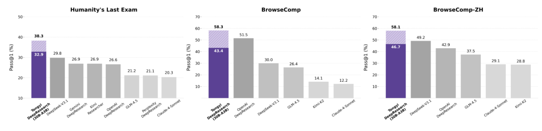 相比于基于基础模型的ReAct Agent和闭源Deep Research Agent,这个30B-A3B轻量级模型Tongyi DeepResearch在HLE、BrowseComp-zh、GAIA等多个权威评测集上取得SOTA成绩,超越了OpenAI Deep Research、DeepSeek-V3.1等Agent模型。