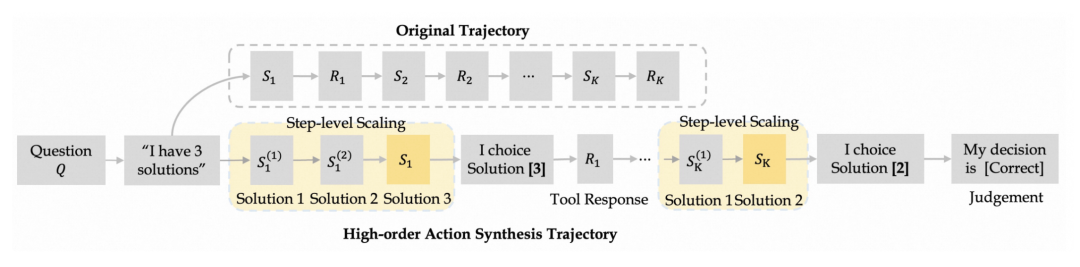 基于多风格问题和历史轨迹数据,我们分别构建了三种类型的动作数据,包含规划、推理和决策动作。我们的方法能够在离线环境下大规模、全面地探索潜在的推理-动作空间,从而消除了对额外商业工具 API 调用的需求。特别地,对于决策动作合成,我们将轨迹重构为多步骤决策过程,以增强模型的决策能力。