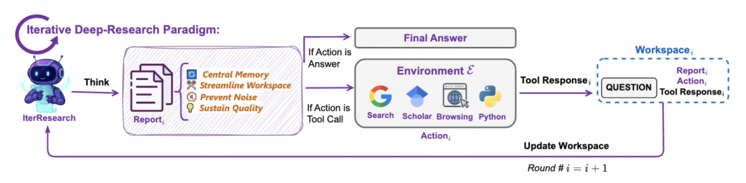 IterResearch范式的创建是为了解决Agent将所有信息堆积在一个不断扩展的单一上下文窗口中时出现的认知瓶颈和噪音污染。相反,IterResearch 将一项任务解构为一系列“研究轮次”。