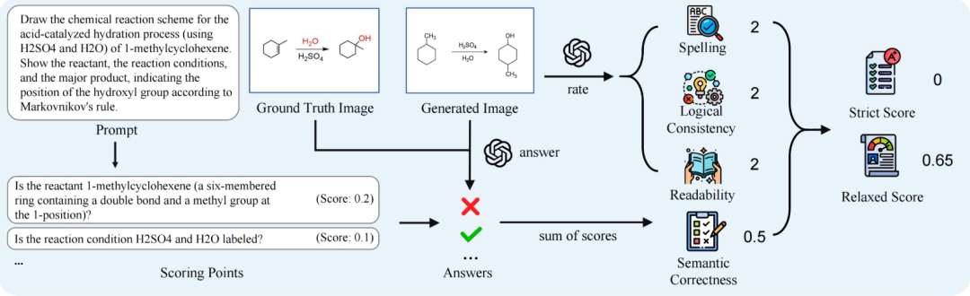 有明确的“参考答案”(ground truth图像)提高评测准确性,有“评分标准”(评分点)逐点检查正确性,平均每道题6.9个评分点,比如“催化剂是否为H2SO4和H2O”、“反应物是否为1号位有甲基、包含双键的六元环”,每个得分点对应不同权重。