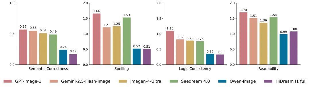 严格得分:只有语义全对+视觉合理性三项全满分才算正确; 宽松得分:语义(70%权重)+拼写(10%)+逻辑(10%)+可读性(10%)的加权平均分,给模型“部分得分”的空间,适合区分模型间的相对差距。