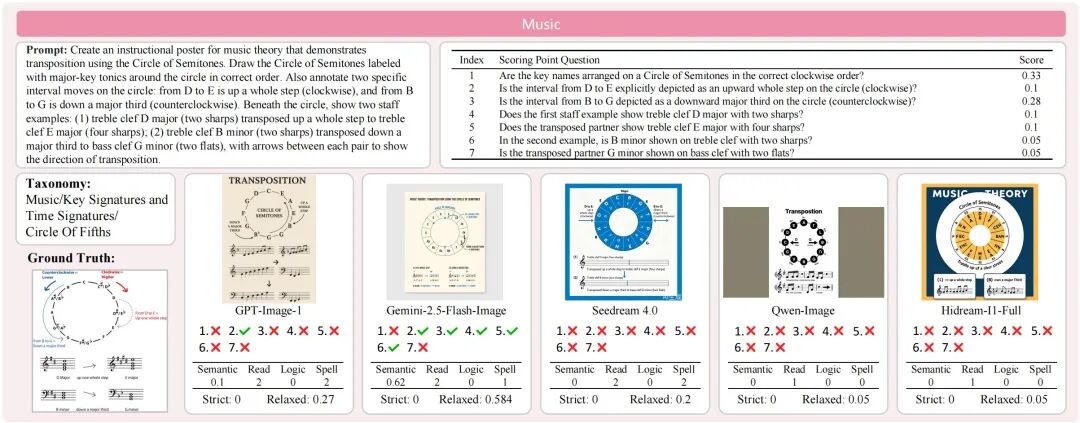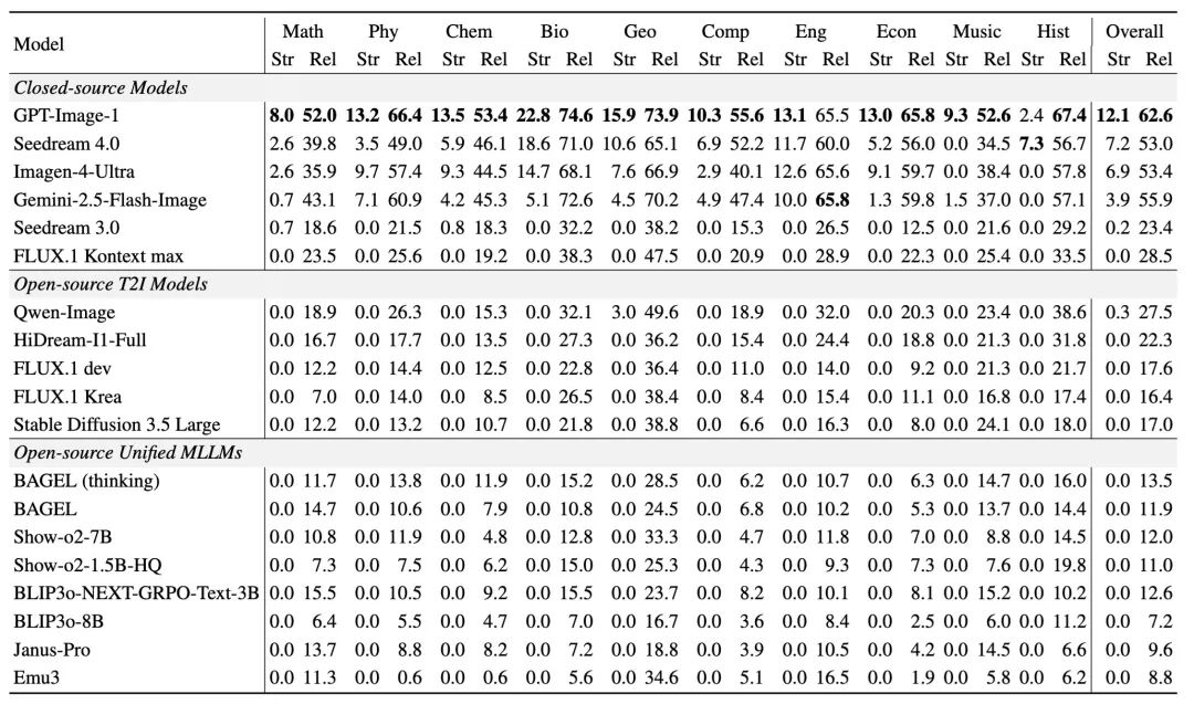 开源模型:所有模型严格得分均接近0%,哪怕是表现最好的Qwen-Image,严格得分也只有0.3%。统一多模态模型(如BAGEL、Show-o2)表现还不如专用文生图模型,暴露出“整合学科知识到图像生成”的能力缺失。