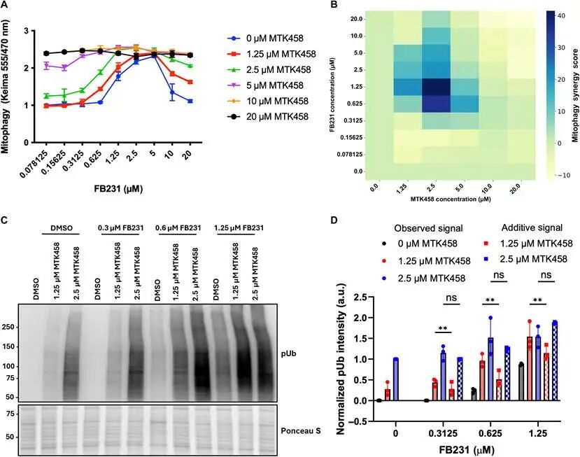 鉴于FB231和MTK458靶向PINK1/Parkin通路中的不同环节,作者探索了这两种化合物是否具有潜在的联用可能。通过对剂量组合进行筛选,并使用ZIP模型计算药物联用效果,发现当FB231浓度在0.625-1.25 μM,MTK458浓度在2.5 μM附近时两者具有明显的协同效果(图2B),对pUb积累水平的表征也较好地证明了相应浓度下两种化合物的协同效应(图2C,D)