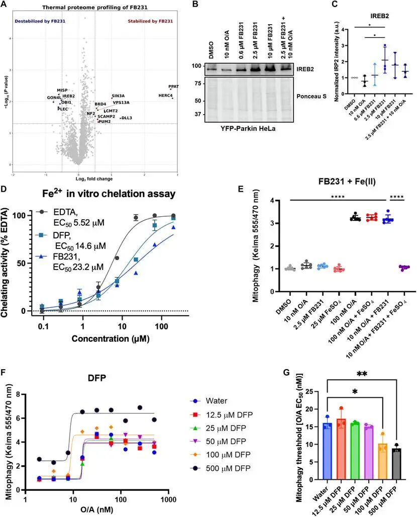 接下来作者用热蛋白质组分析(TPP)研究了化合物对ISR的直接靶点。值得注意的是,TPP实验没有鉴定到FB231和MTK458在胞内与PINK1或者Parkin的结合,尽管原始文献中报道了MTK458与PINK1在细胞内基于nanoBRET的结合实验3。FB231在细胞内的潜在靶标包括E3连接酶HERC4、铁反应蛋白IREB2等(图4 A-C)。作者注意到FB231以剂量依赖的方式诱导了IREB2蛋白水平上调,并通过体外的螯合实验证明FB231可以作为铁螯合剂(图4 D)。由此,作者猜测FB231可能起到铁螯合剂的作用,由于细胞内的铁损失导致FECH丢失、IREB2水平上调,进而增强了线粒体自噬。回补实验结果表明在培养基中补充Fe (II)阻断了FB231激活的线粒体自噬,并且Fe (II)螯合剂去铁素亦能以与PINK1/Parkin无关的方式增强线粒体自噬(图4 E、F)。总结来说,这些实验结果表明FB231对线粒体自噬的激活是通过影响细胞内铁水平实现的,很大程度上与PINK1/Parkin活性无关,从而论证了FB231脱靶效应的分子基础。