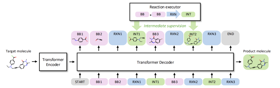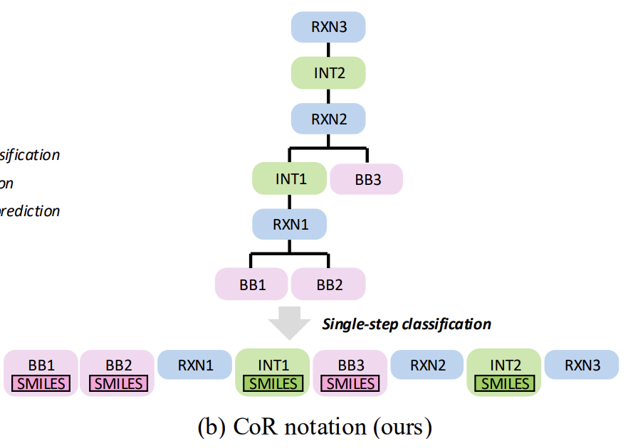 具体实现时,合成路径被分解为多个功能块,所有块共享统一的词汇表,其中分子块(molecular block)采用带特殊标记的 SMILES 字符串表示,反应块(reaction block)等则用单一 token 表示,最终通过拼接操作形成完整的路径序列。