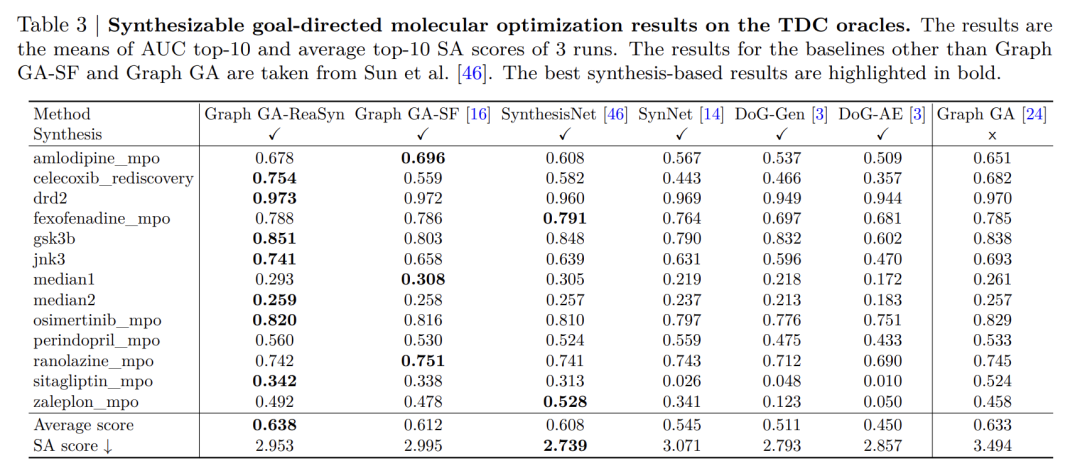 在可合成面向目标分子优化任务中,研究重点考察了 ReaSyn 如何提升传统优化方法的实用性。该任务以图遗传算法(Graph GA)为基础框架,在其繁殖步骤后引入 ReaSyn 进行可合成投影处理,确保所得分子均处于可合成空间内,该方法被命名为 Graph GA-ReaSyn。