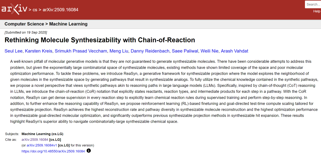 相关研究成果以「Rethinking Molecule Synthesizability with Chain-of-Reaction」为题,发表于 arXiv。