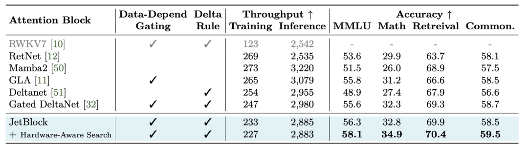 结果显示,JetBlock在数学推理和检索任务上的准确率优于Gated DeltaNet,而且仍然保持了不错的生成效率。