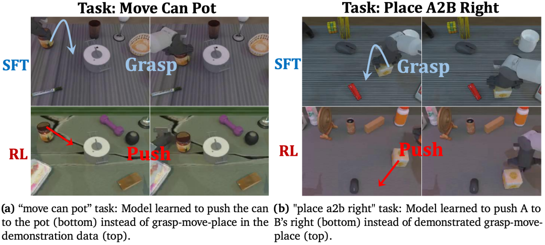 相比之下,经过SimpleVLA-RL训练的模型能够自主探索并发现更高效的替代策略,例如直接通过“推”的方式将罐子移至目标位置。研究团队将这种现象定义为 “Pushcut”,其特征是能够突破人类演示模式限制,利用奖励信号探索并采纳演示外的路径。