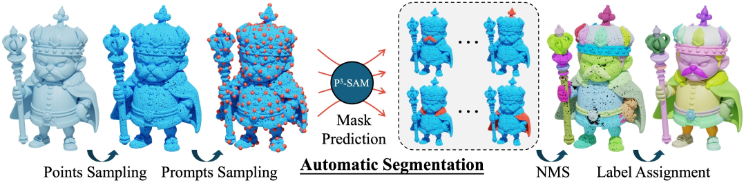 为实现物体的自动分割,如图3所示,团队利用FPS(最远点采样)生成点提示,配合NMS(非极大值抑制)合并冗余掩码。点级掩码随后被投影到网格面上,从而获得部件分割结果。
