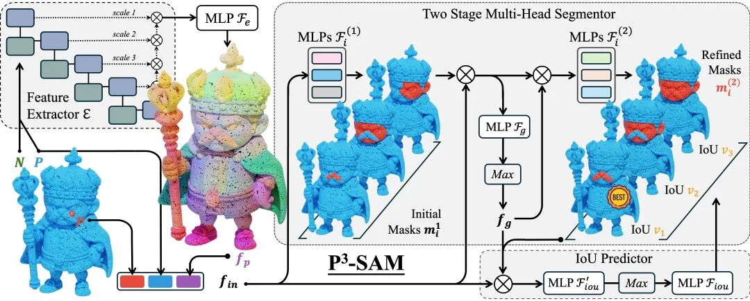 具体来说,如图2所示,P3-SAM包含一个特征提取器、三个分割头和一个IoU(交并比)预测头。