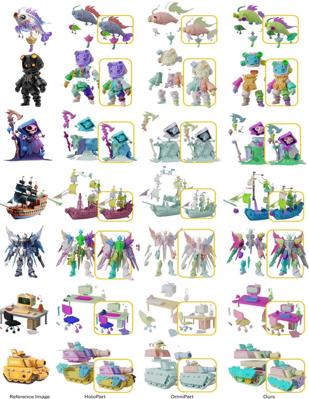 下图为X-Part的生成结果, 左中右依次为输入图、混元3D V2.5生成结果、组件拆分结果。