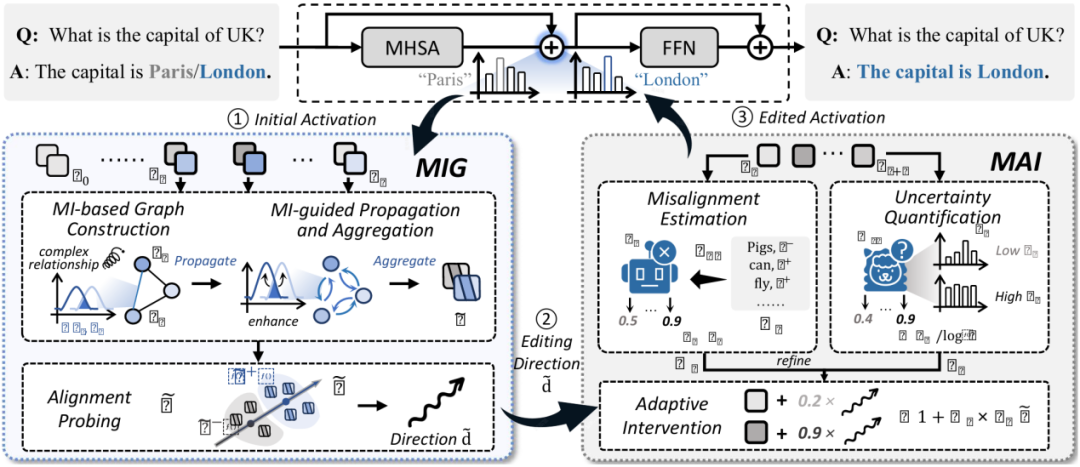 双路错位评估:从表示错位估计和预测不确定性量化两个方面评估token的潜在不确定性程度 动态强度调整:根据错位程度自适应计算干预强度,高风险token强干预,低风险token弱干预。