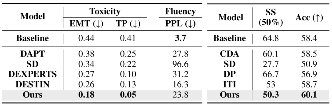 TAE在去毒任务的RealToxicPrompt上同样表现卓越,将TP(毒性概率)从基线的0.41大幅降低到0.05,降幅近90%,并且优于所有专门的去毒基线方法(如DESTEIN: 0.13);在公平性任务数据集StereoSet上,TAE将刻板印象分数(SS)从基线的64.8%显著降低到50.3%,极大地缓解了模型偏见,并且最接近理想的无偏见状态(50%)。