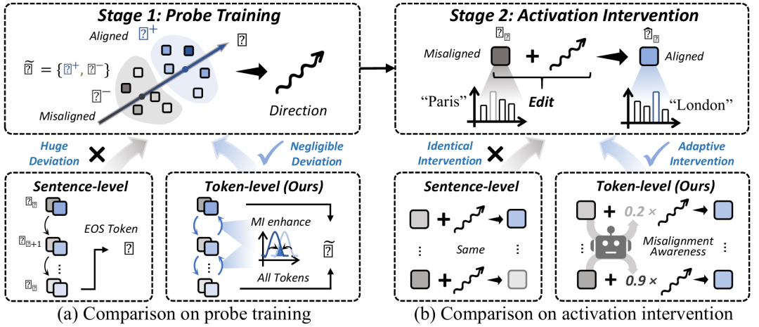 研究团队指出,以往的表征编辑研究(如ITI、TruthX等)大多在句子级别进行激活值编辑,在编辑方向探寻和内部表征编辑两个主要阶段均存在问题: